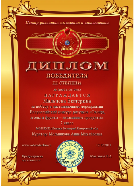 III место во Всероссийском дистанционном конкурсе «Овощи, ягоды и фрукты – витаминные продукты». 2011 г.
