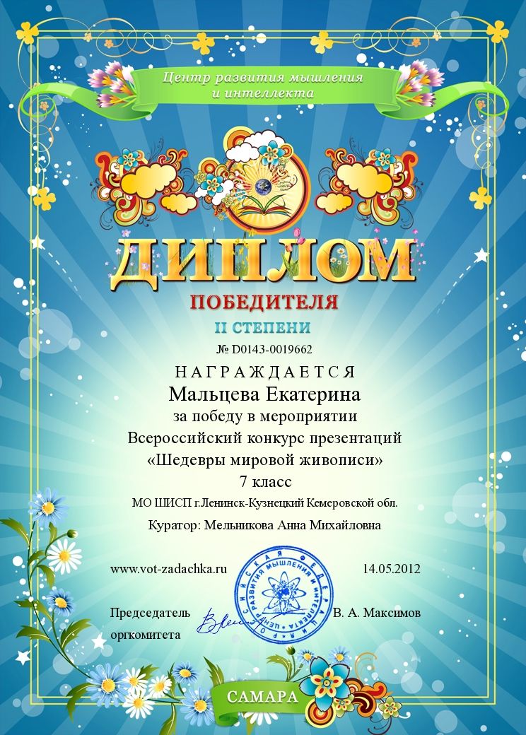 II место во Всероссийском дистанционном конкурсе презентаций «Шедевры мировой живописи». 2012 г.