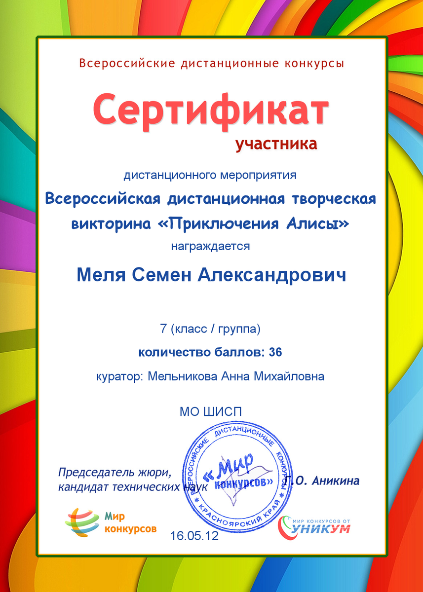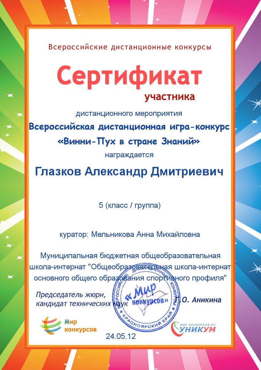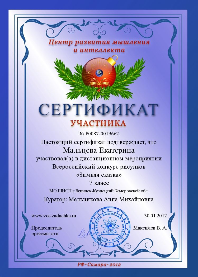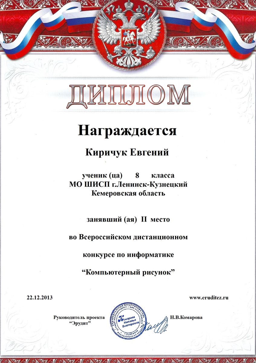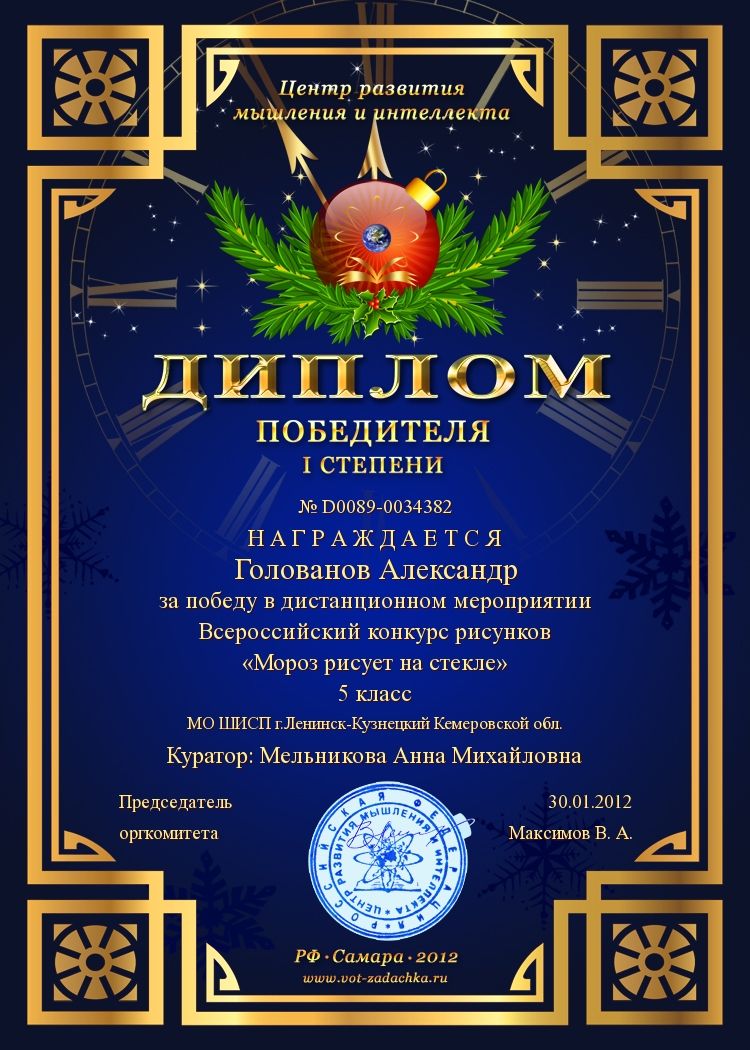 I место во Всероссийском дистанционном конкурсе «Мороз рисует на стекле» в номинации «компьютерная графика». 2012 г.