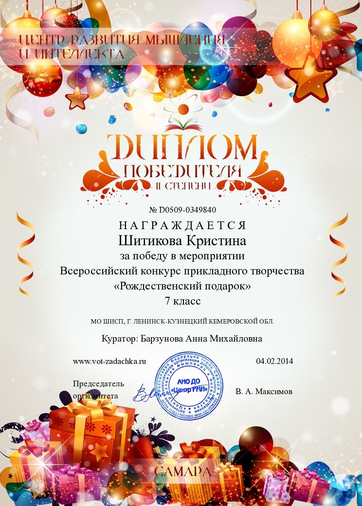 II место во всероссийском творческом конкурсе прикладного творчества «Рождественский подарок». 2014 г.