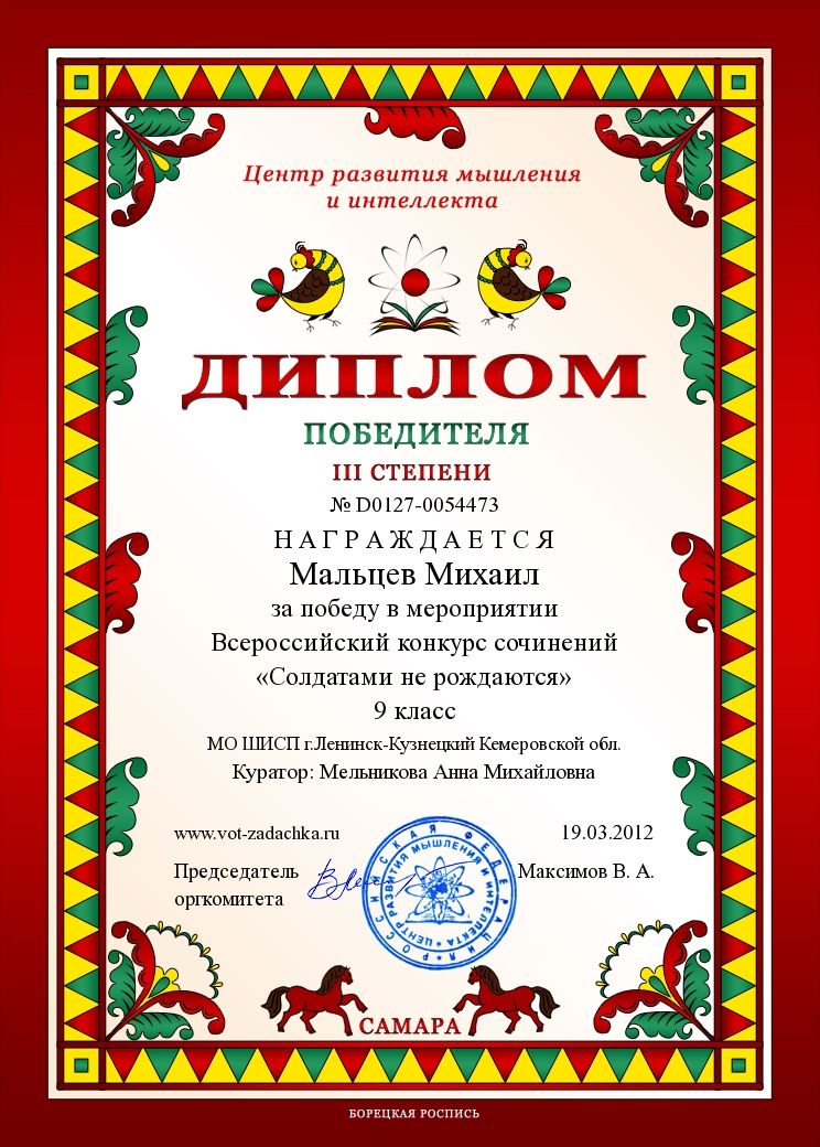 III место во Всероссийском дистанционном конкурсе «Солдатами не рождаются». 2012 г.