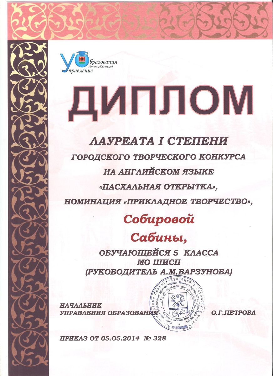 I место в муниципальном творческом конкурсе на английском языке «Пасхальная открытка». 2014 г.