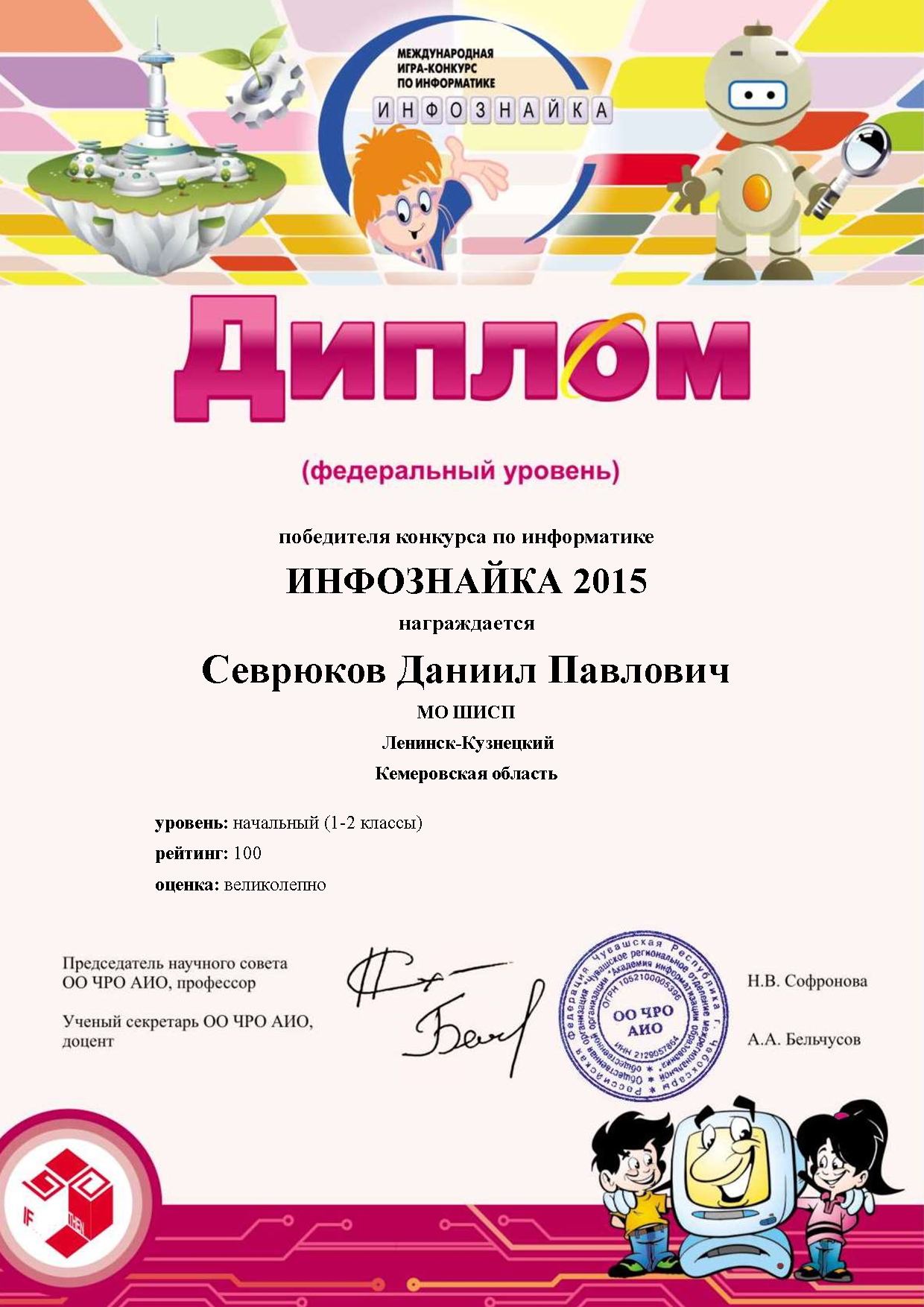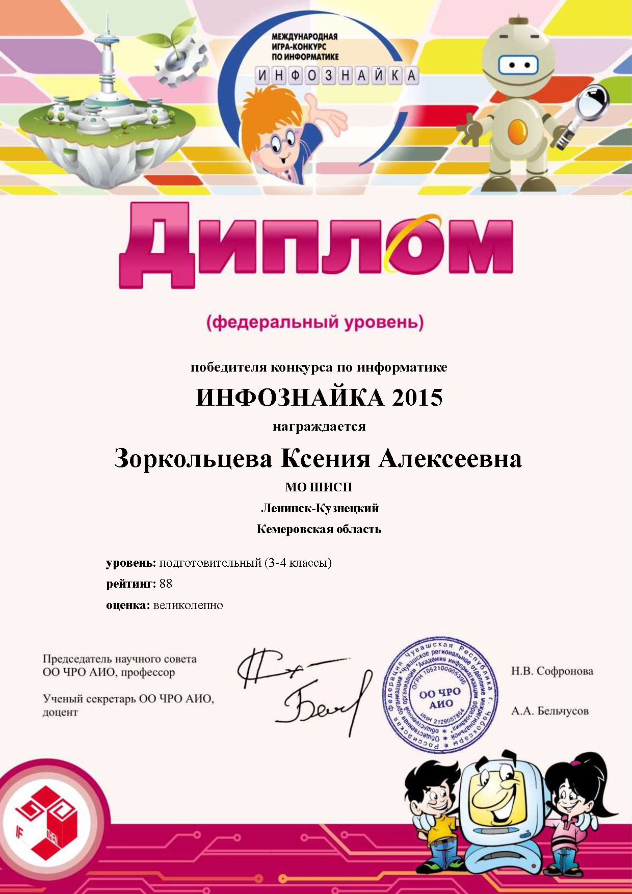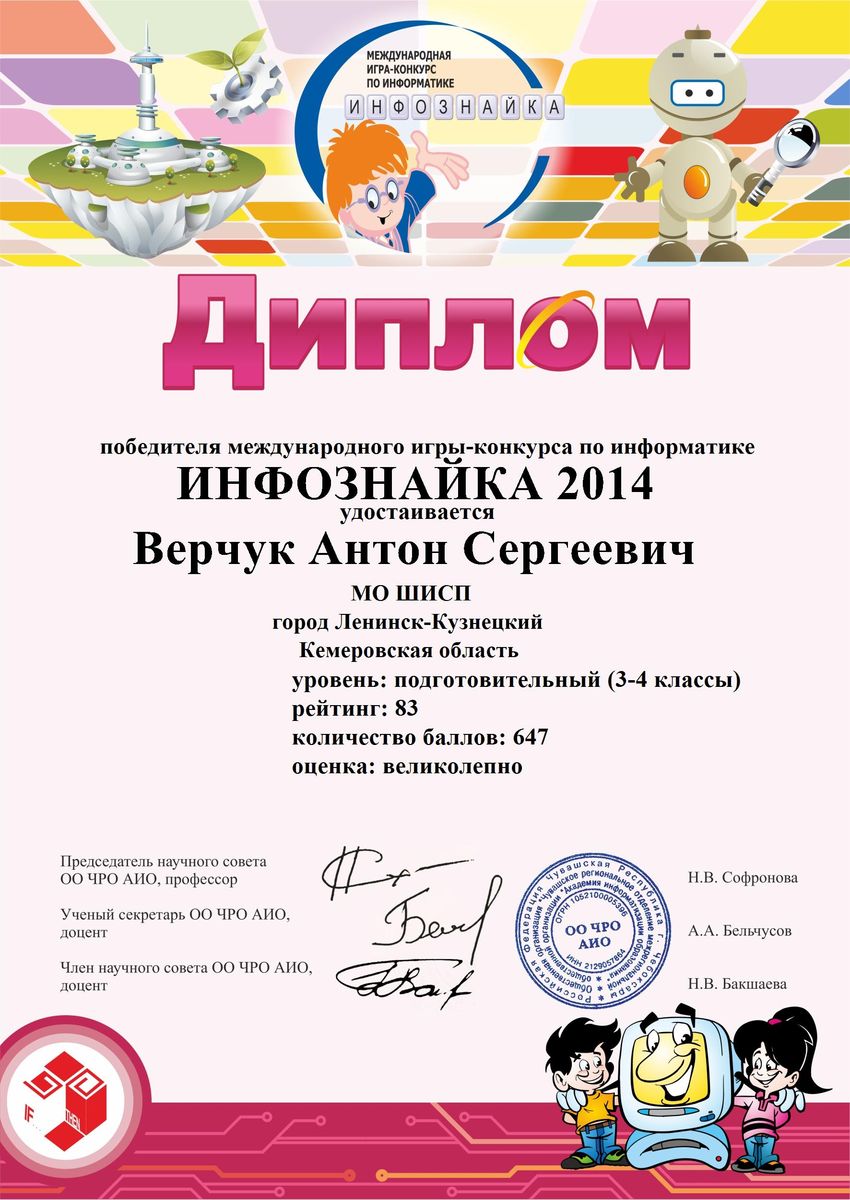 I место в Международной викторине-игре по информатике «Инфознайка». 2014 г.