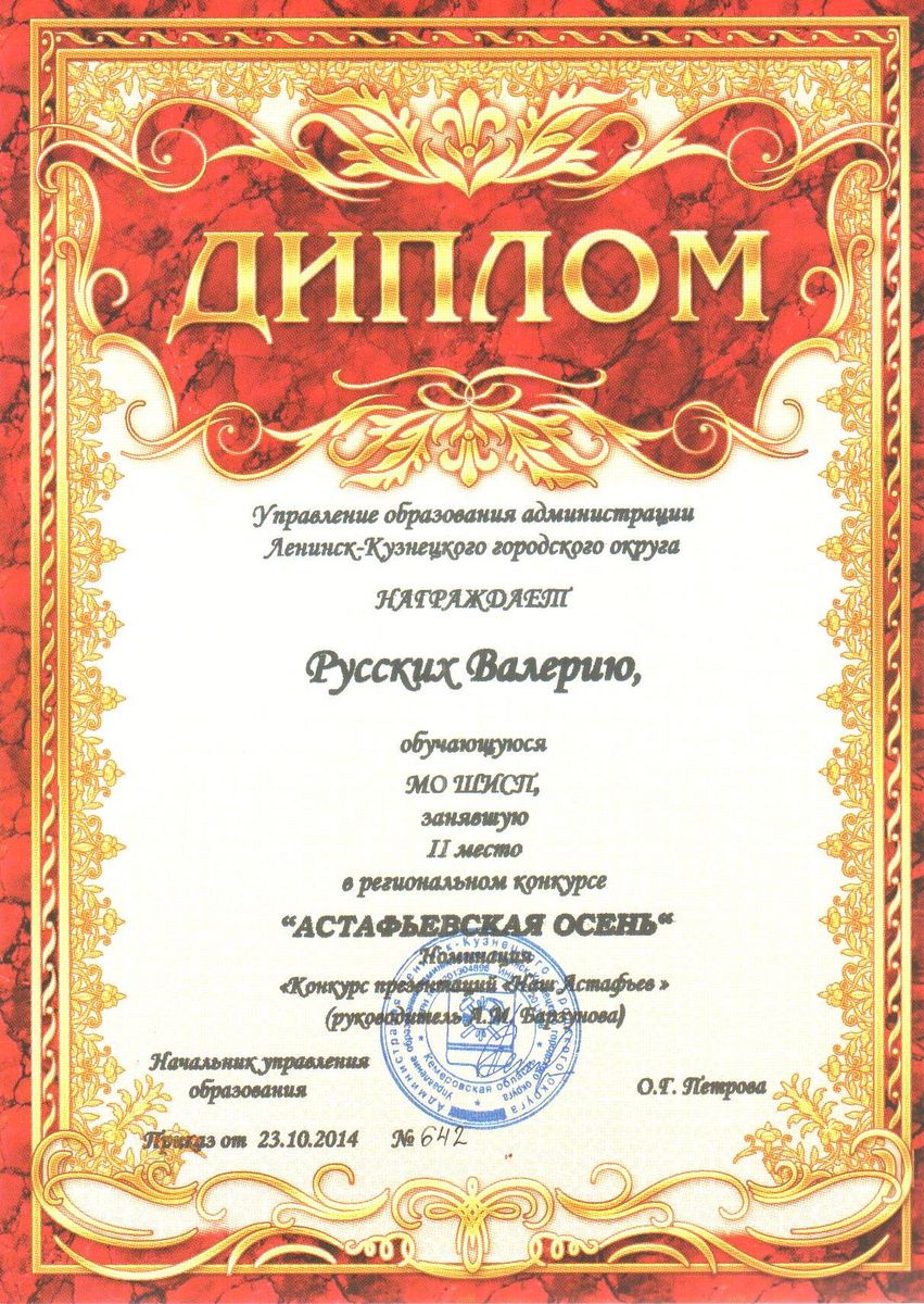 II место в региональном конкурсе «Астафьевская осень» в номинации «Презентация». 2014 г.