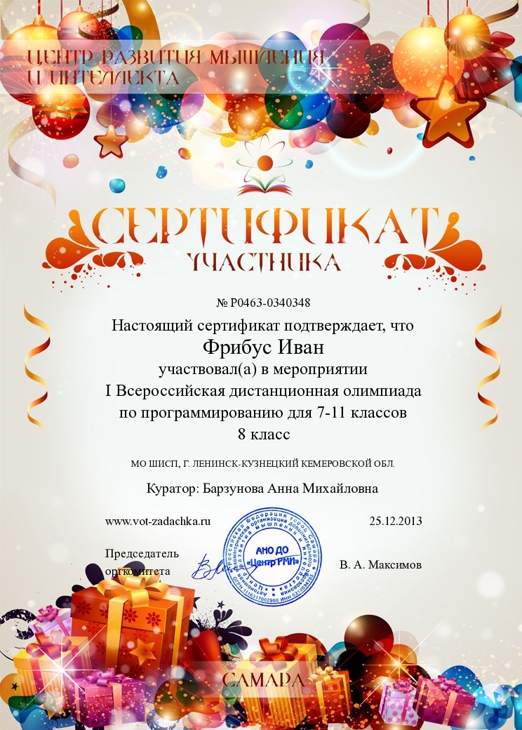 II место во II туре всероссийской дистанционной олимпиаде по информатике. 2013 г.
