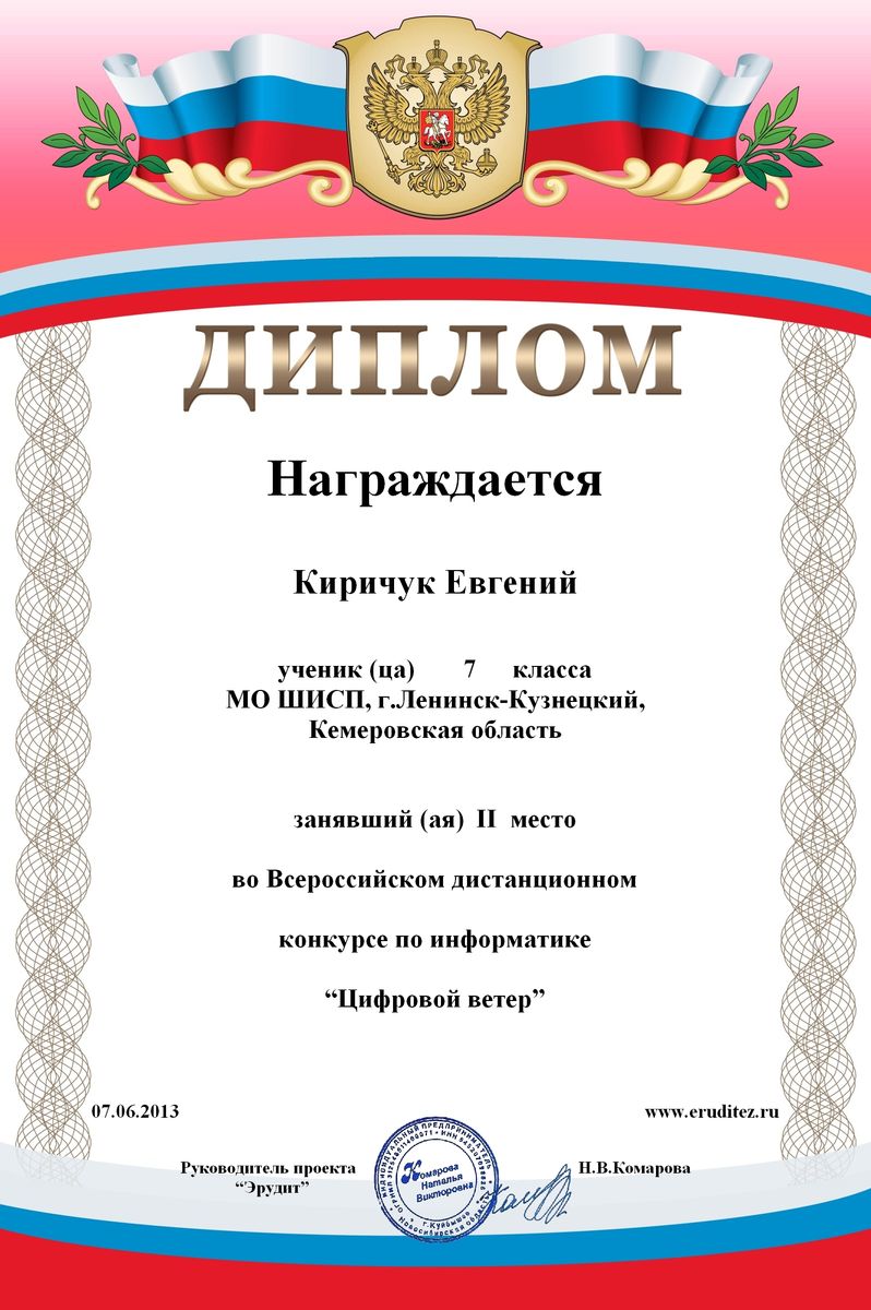 I место во всероссийском дистанционном конкурсе компьютерного творчества «Цифровой ветер». 2013 г.